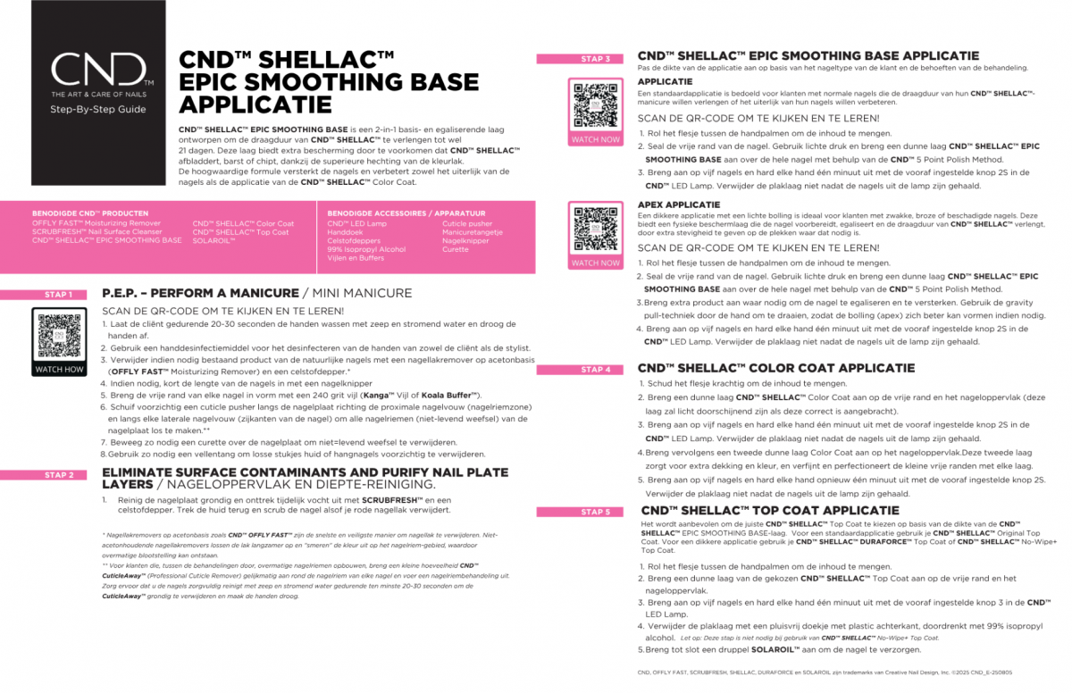 Gebruik: Goed schudden voor gebruik. Breng een dun laagje aan op alle gereinigde nagels. 10 seconden uitharden onder de CND UV-lamp. Herhaal voor de andere hand. Breng daarna de CND SHELLAC Color Coat of kleurlaag aan.