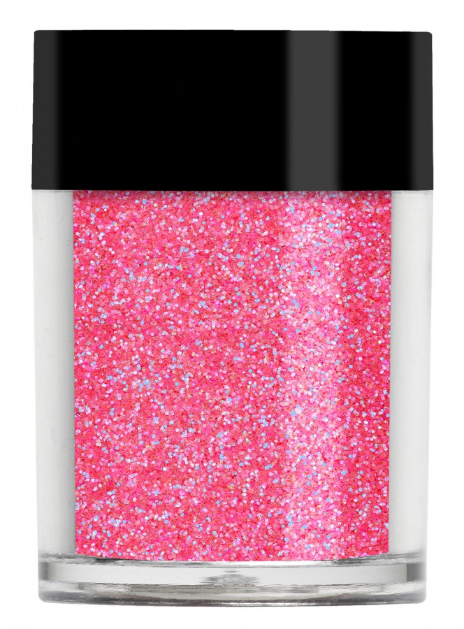 Een levendige, fluorescerende, doorschijnende roze glitter met blauwe ondertonen. Deze glitter verandert van kleur, afhankelijk van de basis waarop het geplaatst wordt.
